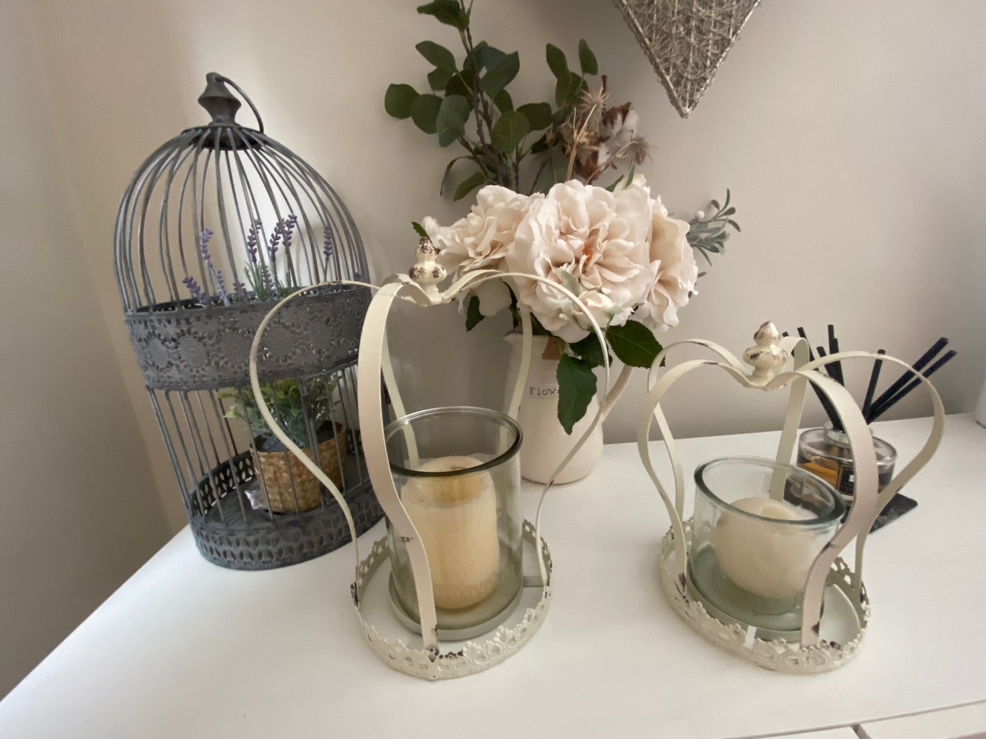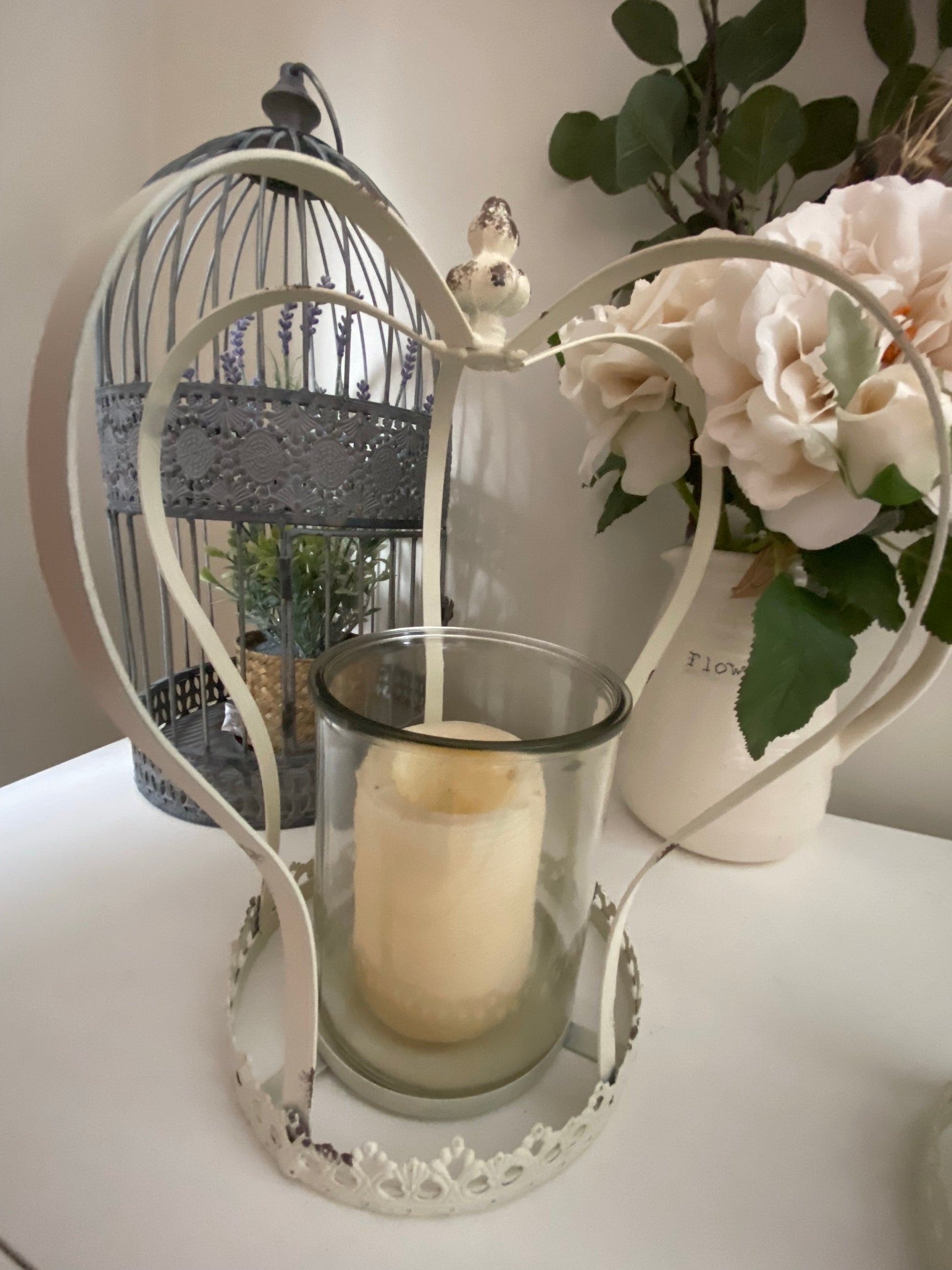 An antique style cream metal crown with glass candle holder or can be used as decorative planter.