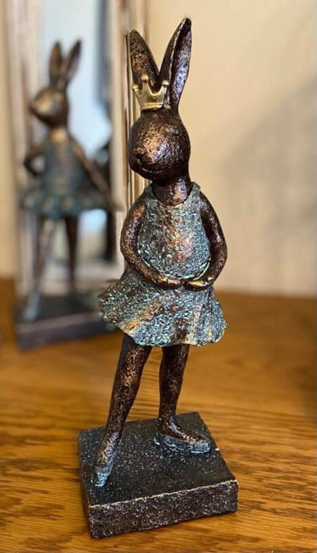 Made from bronze finish resin, Princess Penelope bunny is shown in a verdigris finish ballet dancer's tutu, in a perfect poise as she prepares for a pirouette.