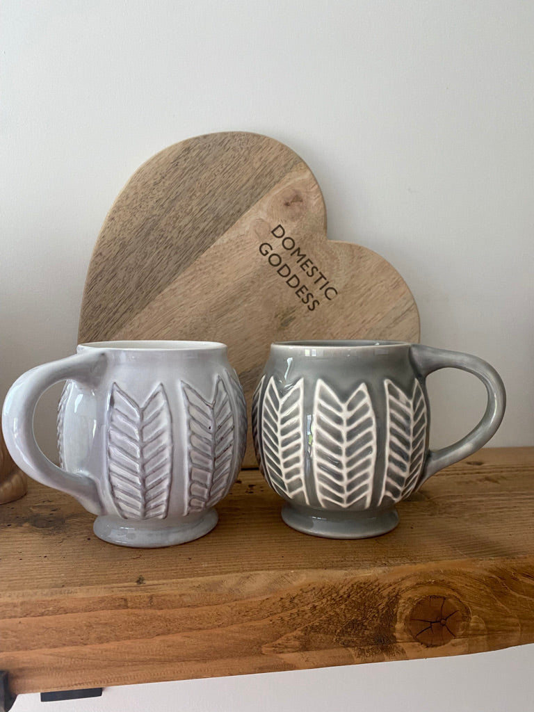 Beautiful Ceramic Mugs available in two colours (Light Grey and Dark Grey) to match both contemporary or traditional style - great for that first cup of the day. Etched Design to enhance the detail.