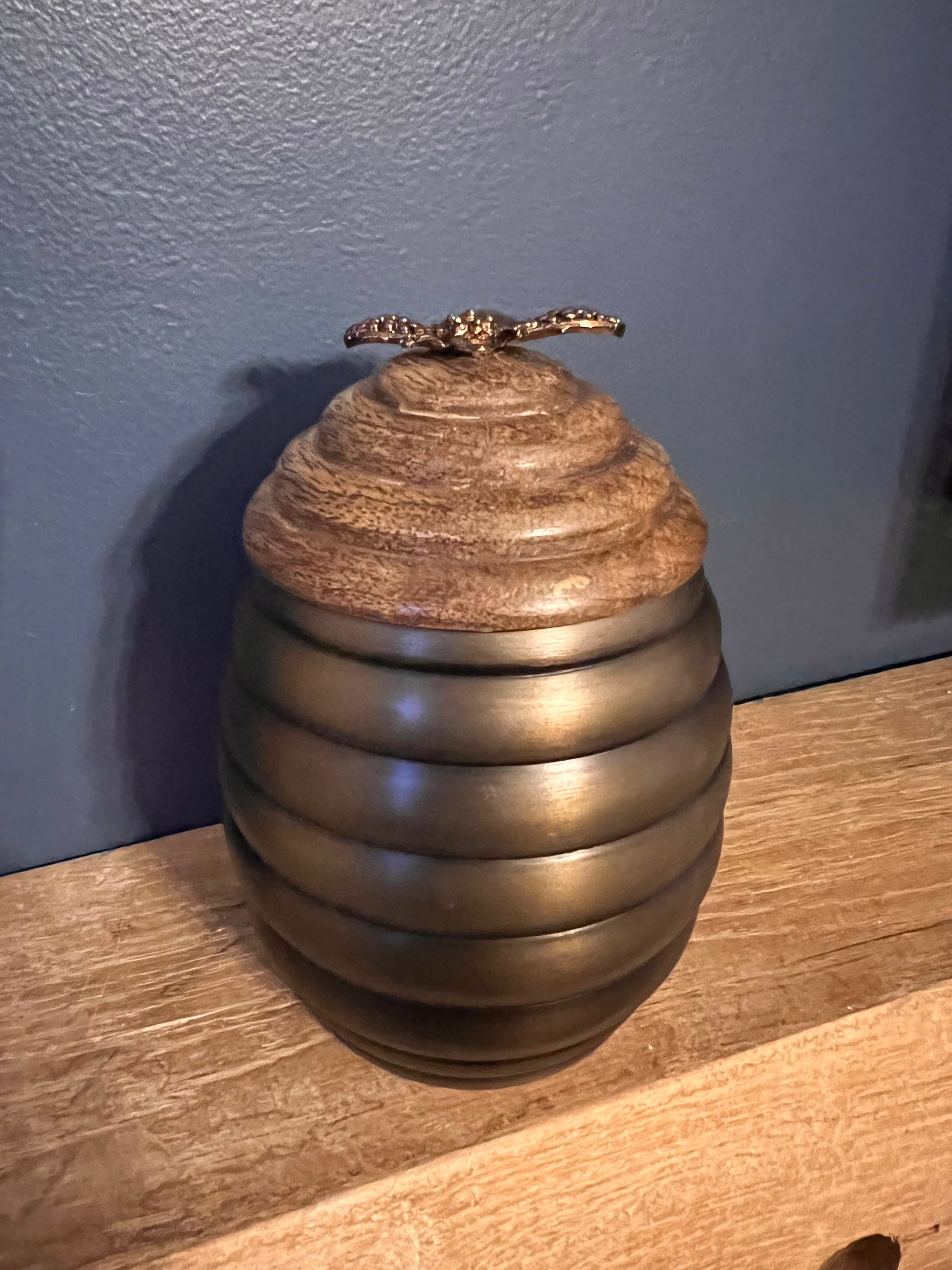 The Arad Candle features a bee on the lid, to add a cute decorative touch. The pot and lid have a ridged design, with a brushed gold finish to the pot and natural wood finish for the lid.