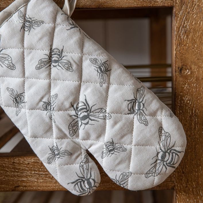 This stylish single oven glove features a chic printed vintage bee design and a distressed chambray look edging to complete the look. Made from 100% cotton, this pleasing single oven glove is available in a Eucalyptus