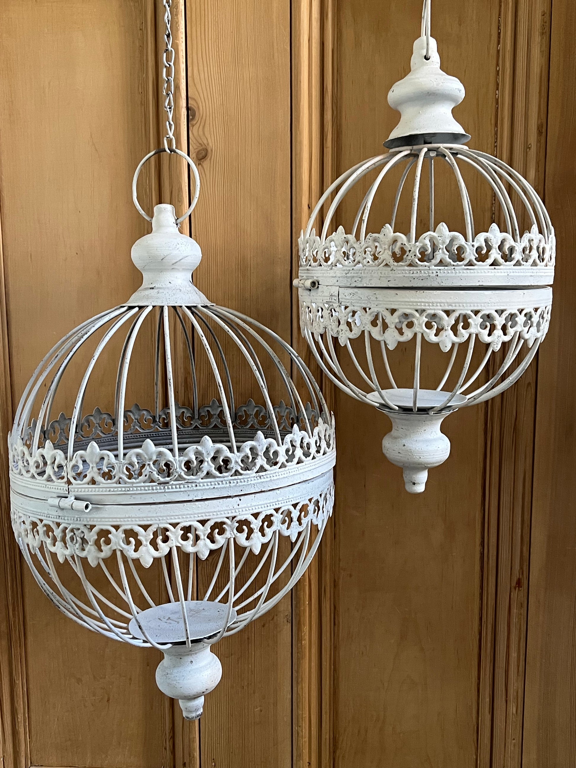 Whitewashed metal orb plantholders, the perfect alternative to a standard hanging basket. Also great for conservatories or indoors. Hinged with a clasp around the central band for easy access can be used as hanging planters or Candle Holders Garden or indoor Decoration.