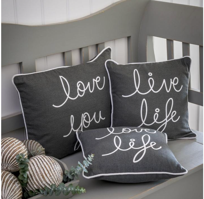 Beautiful cushions with lovely quotes on them and easy to style up in any home. Makes a lovely gift to express your love to someone, that will make them smile. Grey Flour sacking cushion piped and printed in white.