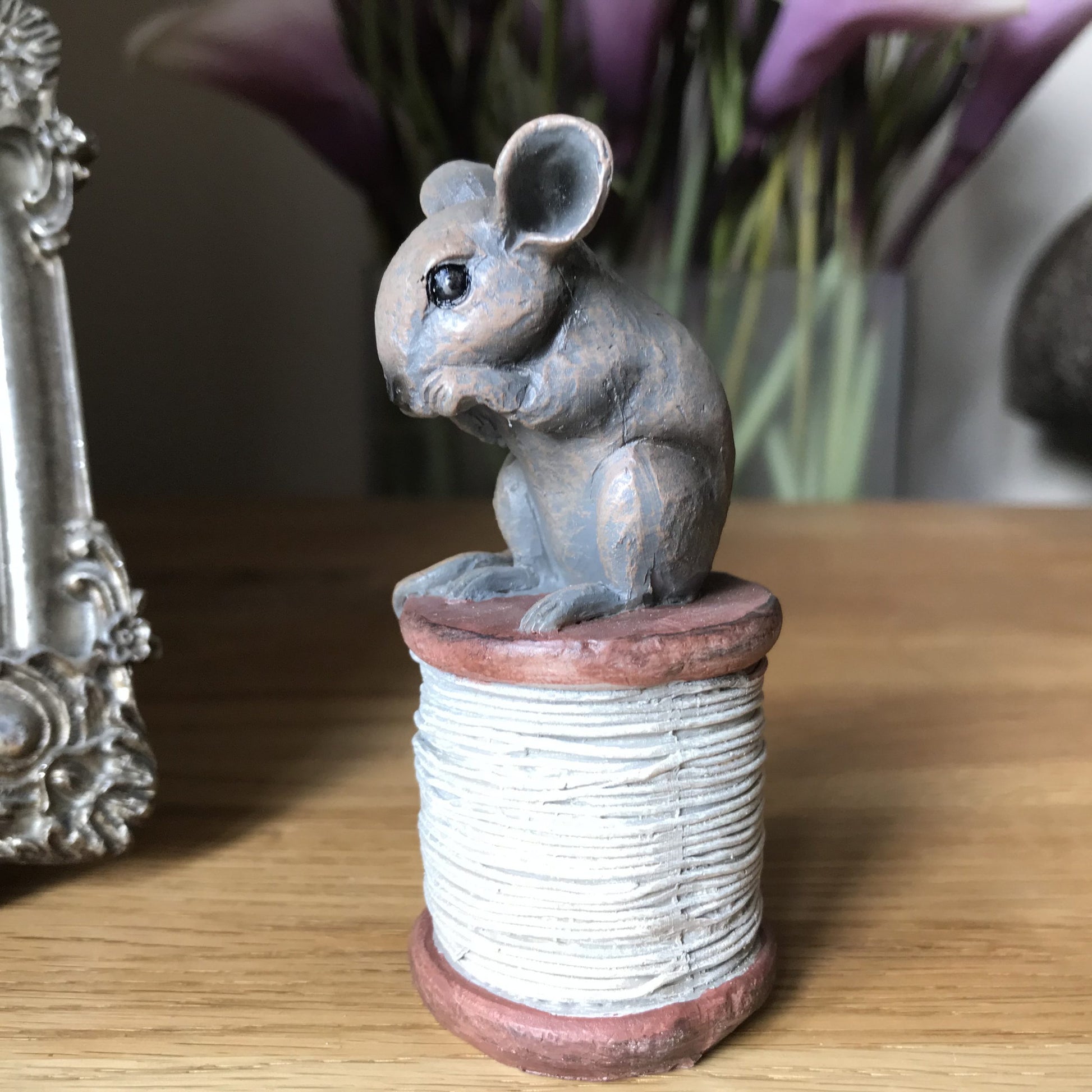 This life size little mouse sits on a vintage style cotton reel.
