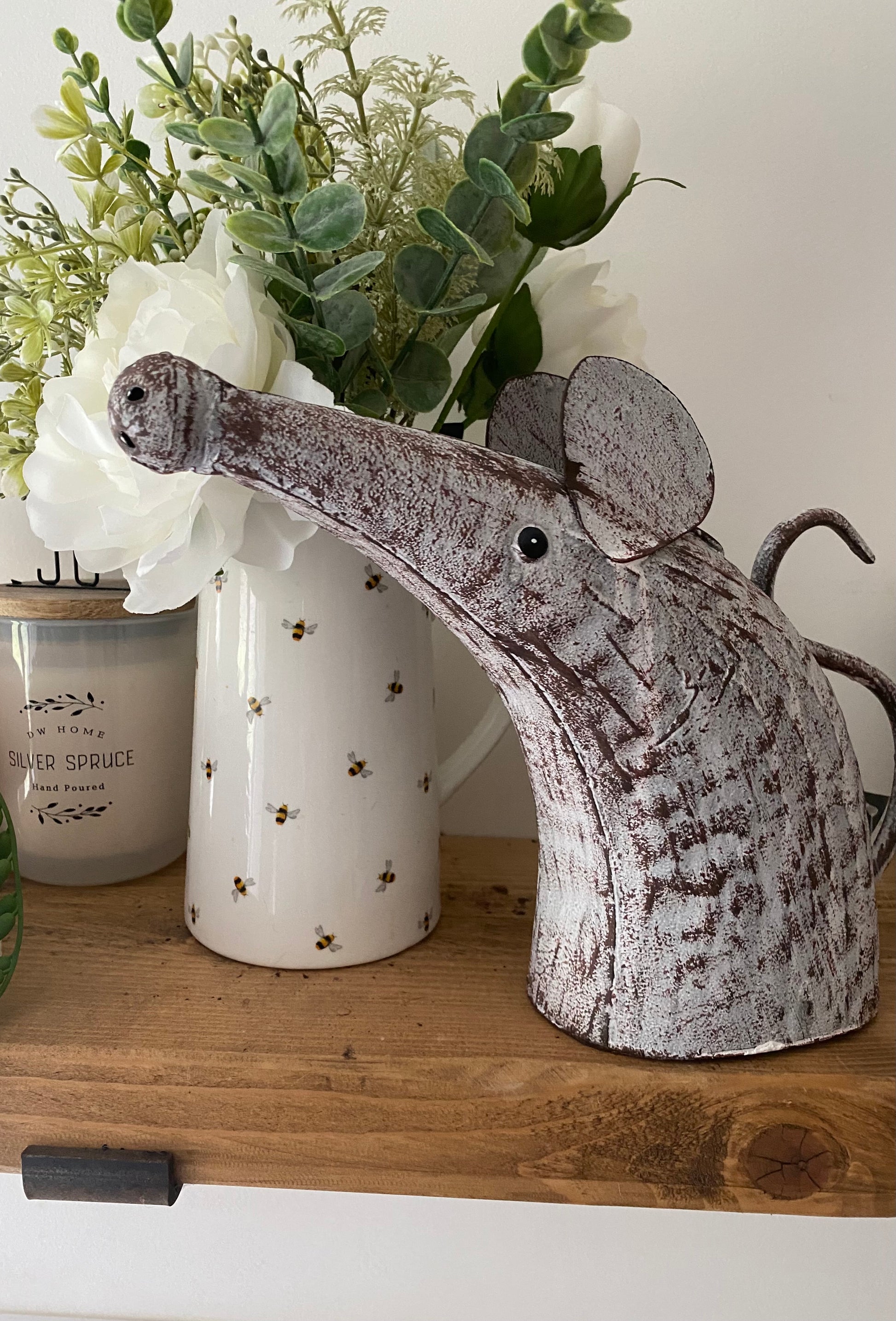 Made from good quality galvanised metal, rough white washed in texture ,with realistic eyes and large rounded ears. The snout of the watering can has Large holes for watering, and the handle is it’s tail held.