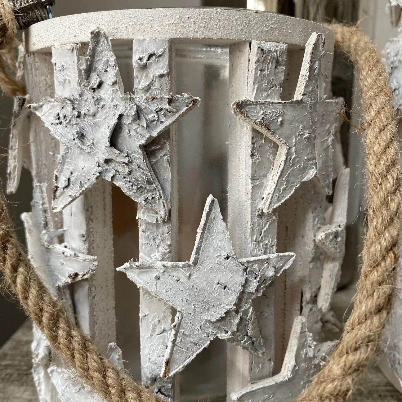 Whitewashed birch lantern with rope handle and decorated with stars. This is the large size and has a diameter of 16 cm and stands at 25 cm high and has a glass insert